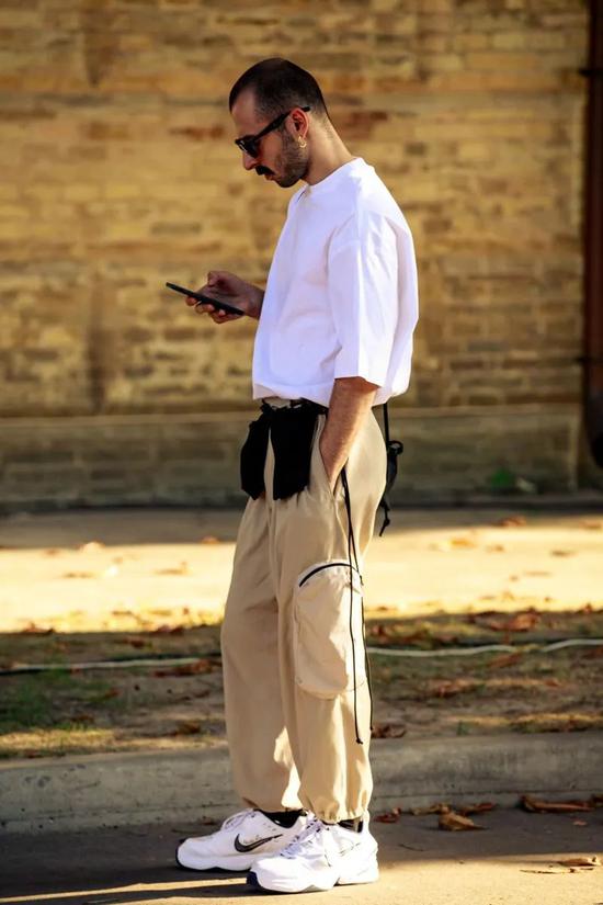 所以光头,寸头型男,穿白色时,最好是加入一点其它纯色单品来组合搭配一下,既有了色差层次对比,质感不俗,又保留了整洁利落的优势。