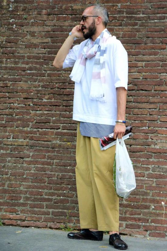 即便是T恤,衬衫这样夏日基本款,你也该保持它应有的质感,选择面料克数重磅一点的,远比轻透的质地款式来得更加安全和谐,要避免廉价,俗气的风险。