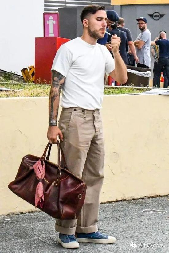 这可说是最基本的配搭了,不过希望增添时尚度的话,可以选择有些破旧的牛仔裤,看起去有点坏男生的感觉,也为整个造型加了层次。