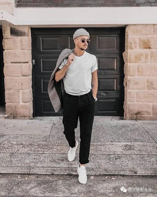从古到今黑色跟白色都是最好的配搭,白T恤配黑色长裤已经可以出门了,当然留意的是裤子的剪裁跟款式也是很重要。想加一点街头时尚风格,再戴上棒球帽就行了。