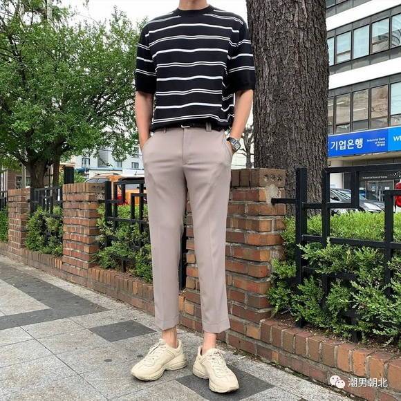 黑白条纹T恤打造简约风格,裤子是米白色的九分裤,整体看上去显高显瘦,展现街拍潮男风格!
