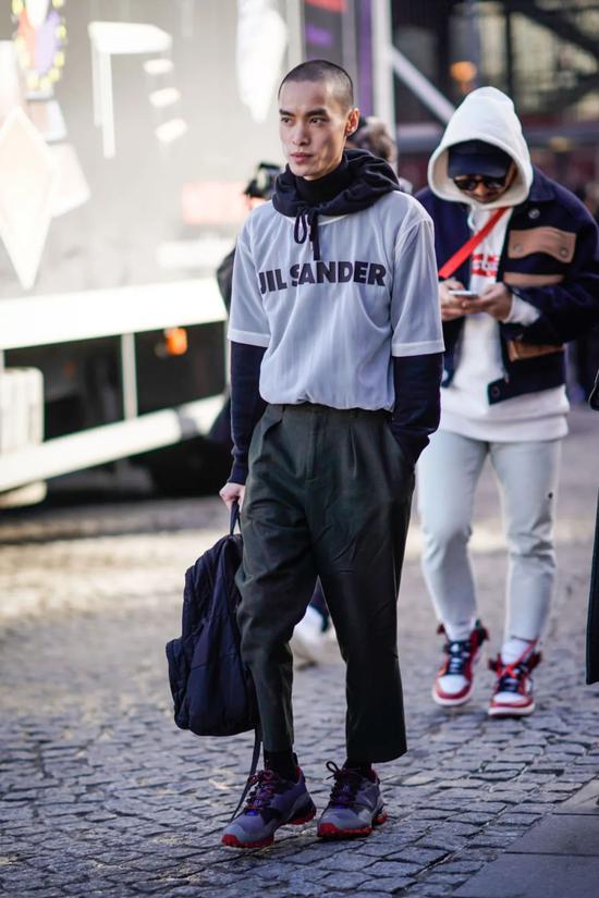 于光头,寸头型男来说,假如你没有偏瘦痞气的优势,那么宽松的版型就和出众的质感一样,能够弱化头部没有遮掩的感觉,不逼仄的宽适空间感带来了足够自然舒适的风格状态。