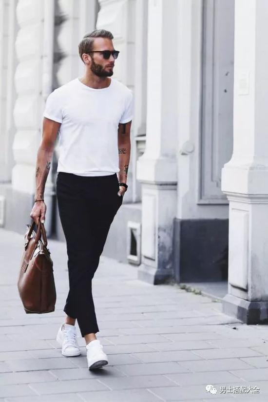 从古到今黑色跟白色都是最好的配搭,白T恤配黑色长裤已经可以出门了,当然留意的是裤子的剪裁跟款式也是很重要。想加一点街头时尚风格,再戴上棒球帽就行了。
