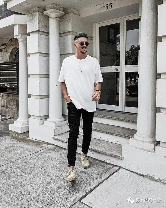 这可说是最基本的配搭了,不过希望增添时尚度的话,可以选择有些破旧的牛仔裤,看起去有点坏男生的感觉,也为整个造型加了层次。