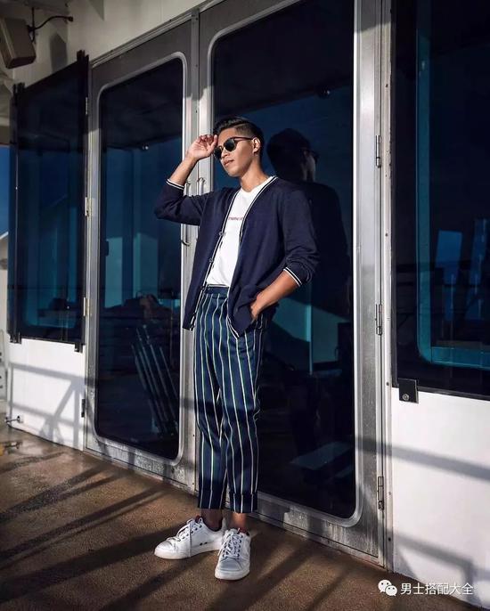 不要觉得自己黑,就穿不出绅士风,西装裤淡蓝色衬衫与小皮鞋轻松打造绅士风,整体感觉也不会很突兀。黑白条纹与黑色裤子的跳跃搭配,简简单单,非常值得大家去借鉴。
